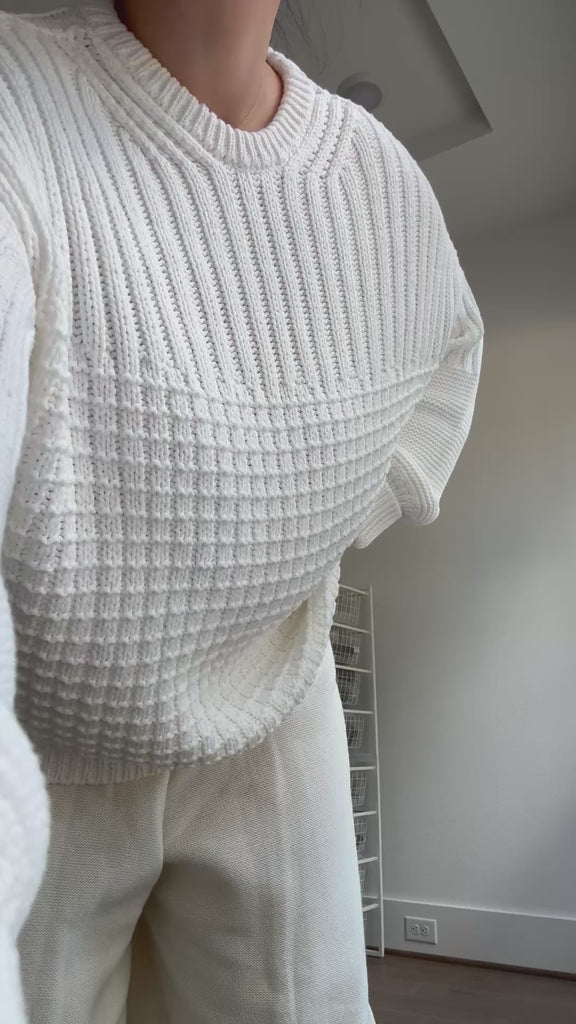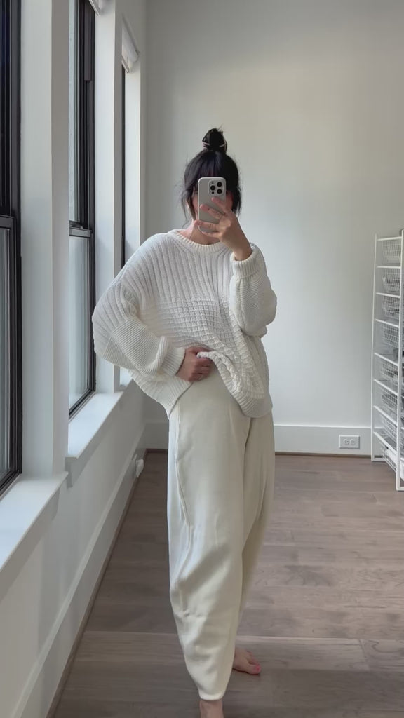 "Delčia" means "half-moon" in Lithuanian, and her half-and-half stitching was inspired by the designer's Baltic pagan roots and the changing cycles of the moon. In pagan culture, people are big believers in the moon's energy and staying in touch with it. The Delčia organic cotton sweater embodies that perfect balance between the two extremes of the young moon and the full moon. Additionally, the sweater is designed with an oversized width that stays consistent across all sizes, providing comfort and a relaxed silhouette for every wearer.