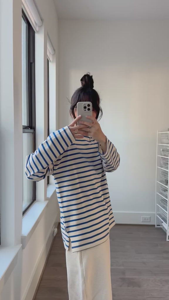 Add a touch of Parisian flair to your wardrobe. The Marseille Top takes inspiration from the timeless Breton stripe uniform, featuring a classic round neckline and an oversized, full-length fit that gently sweeps the hips. Crafted from durable, heavyweight cotton, it offers structure without sacrificing softness, making it an ideal choice for both elevated and casual looks.